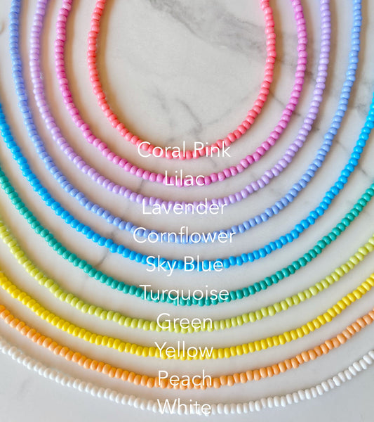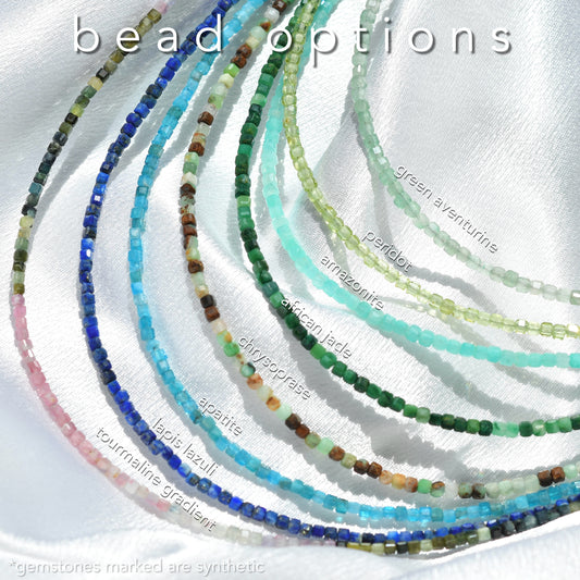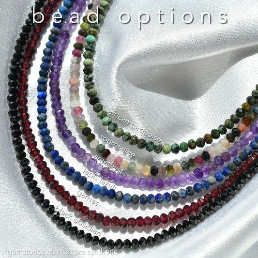 Waterproof beaded necklaces made with either stainless steel findings or gold-filled findings. They are made on a flexible wire for added durability. These necklace come in lengths 14-24" so they can be worn as a choker or a long necklace. They are adjustable so these beaded necklaces are perfect for layering!