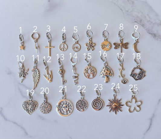 Silver Earrings, Silver Dangle Huggies, Hippie Silver Earrings, Hypoallergenic Hoops, Silver Charm Huggie Hoops