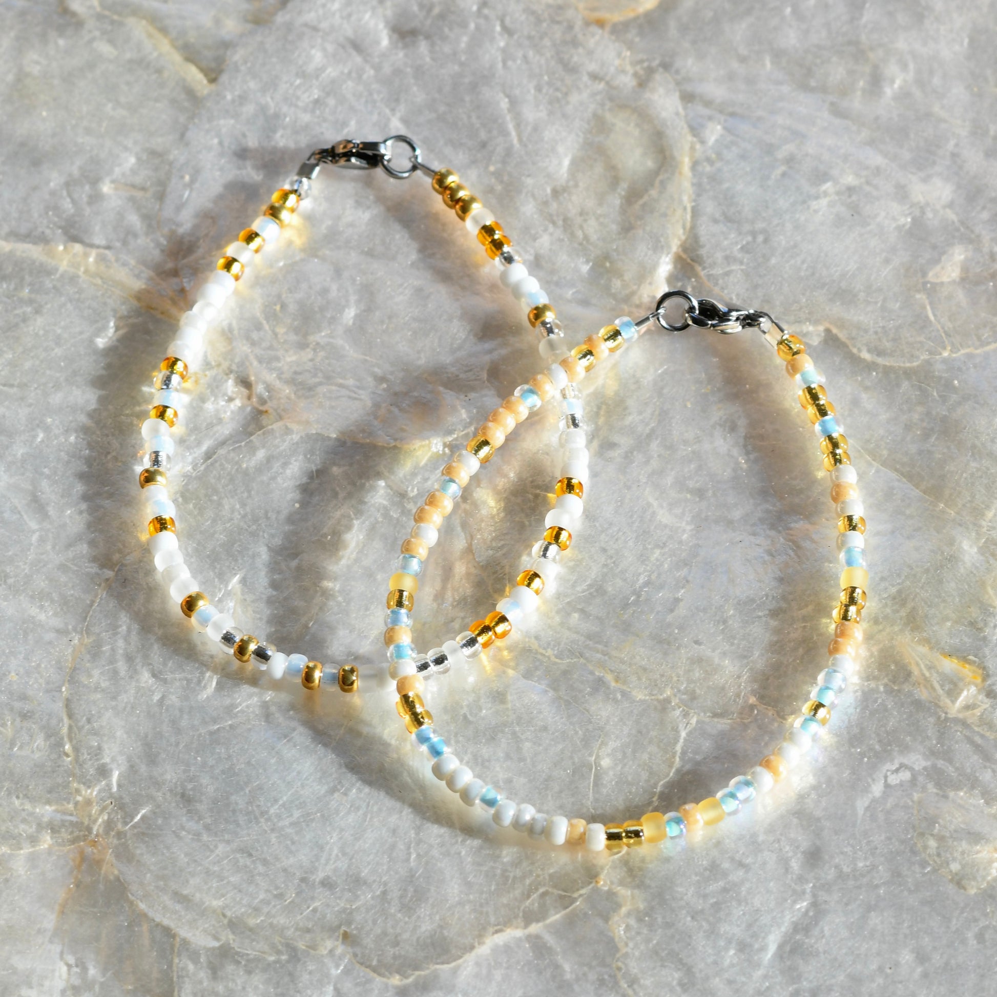 This bracelet/anklet is made on a flexible wire for added comfort and durability. The closure is a lobster clasp. These are made with stainless steel findings and hold up great in the water and for everyday wear. Keep in mind that these DO NOT stretch so an accurate measurement is highly recommended!