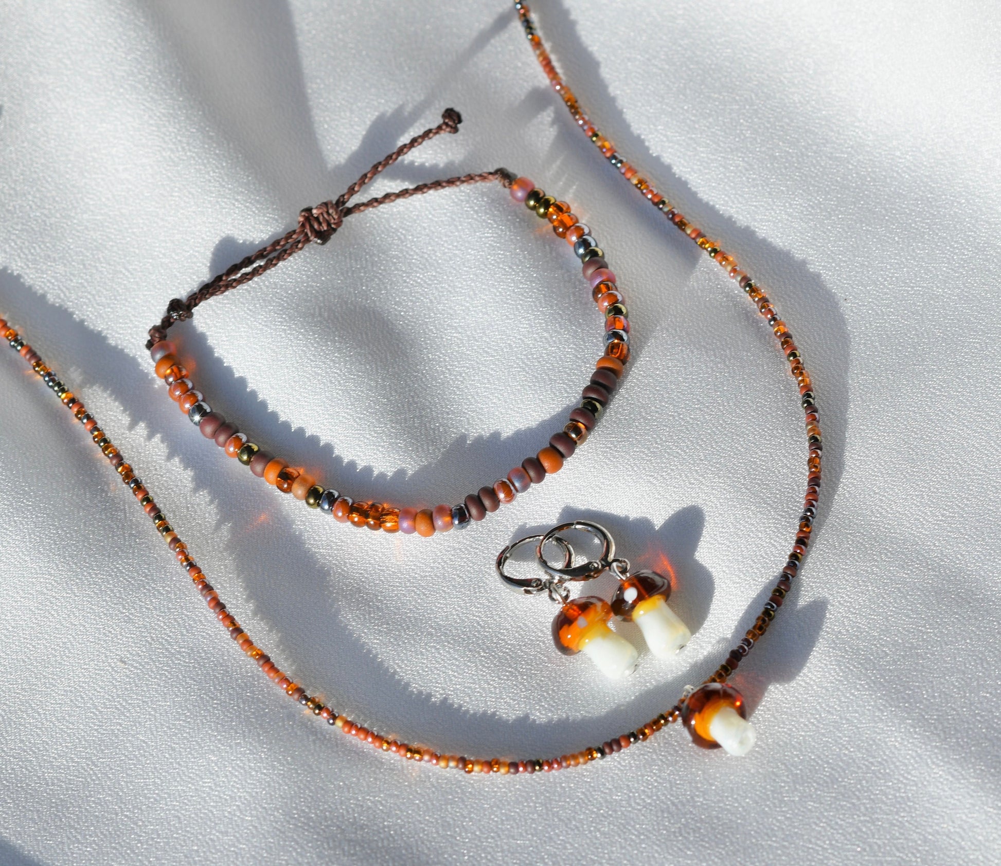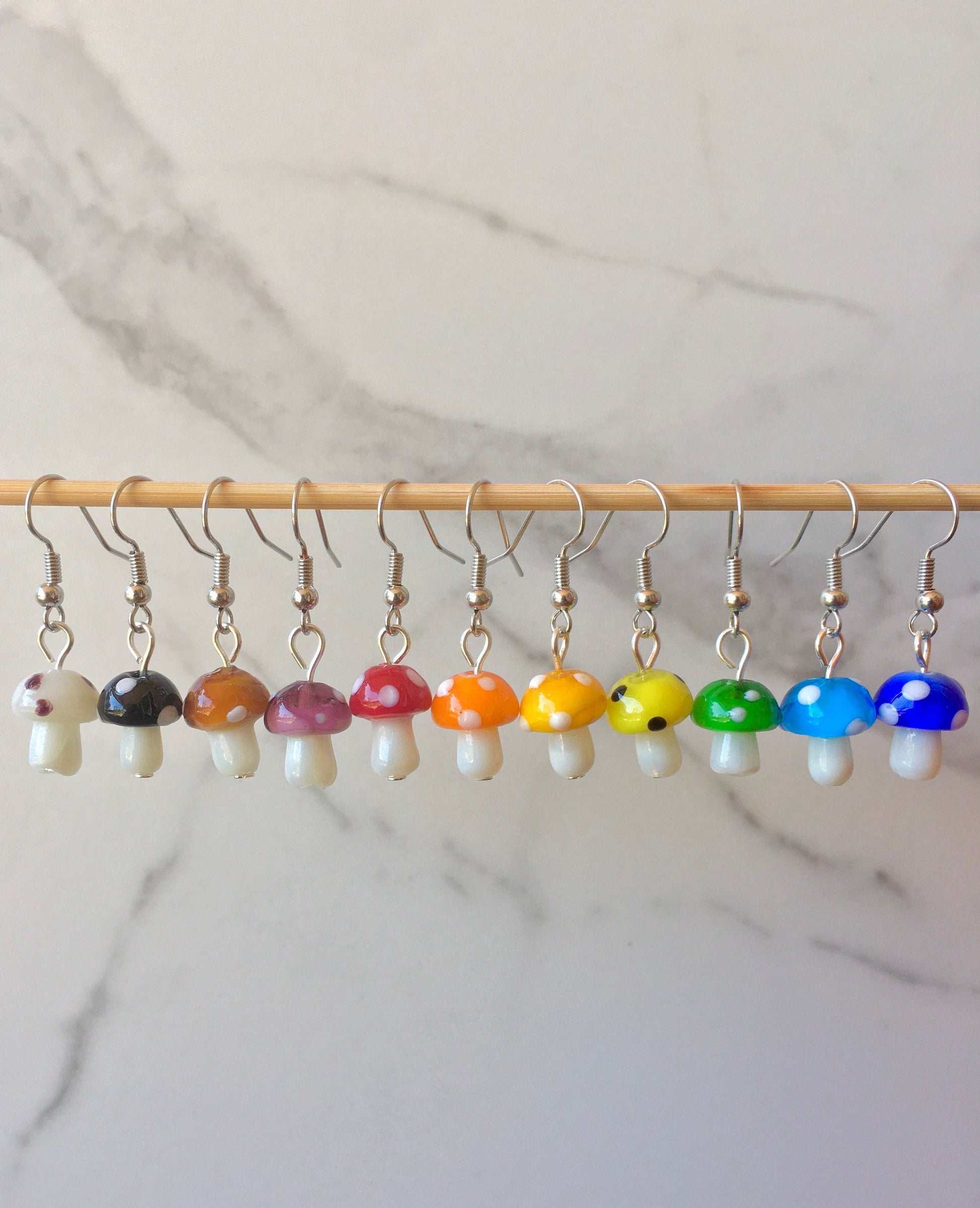 These are beautiful mushroom earrings made out of glass. You will receive a pair of earrings as well as a pair of silicone earrings backs. Each earring is made using glass beads that are hand-strung onto gold or silver wire and made into gorgeous statement earrings. Each pair of earrings are unique and one-of-a-kind!