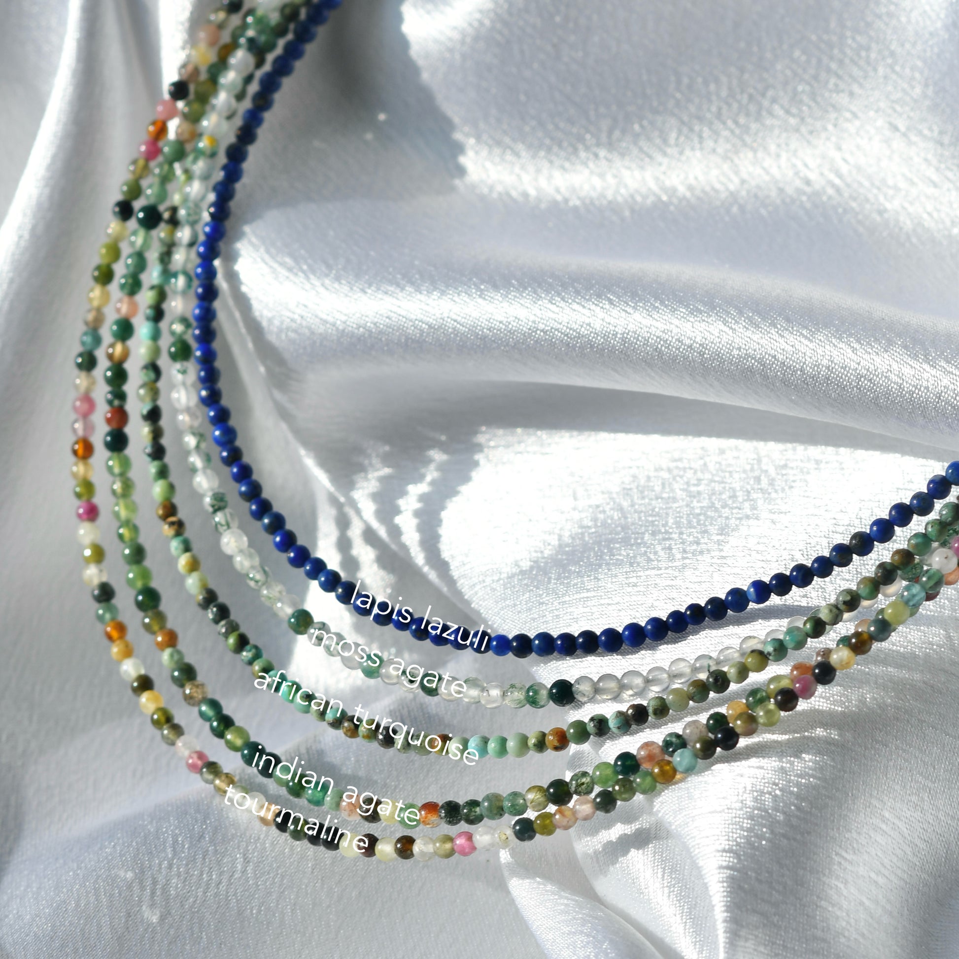 A dainty yet durable gemstone necklace! The size of these beads makes them a dainty addition to any outfit. Made with hypoallergenic and waterproof findings, beaded on a flexible wire for added durability.